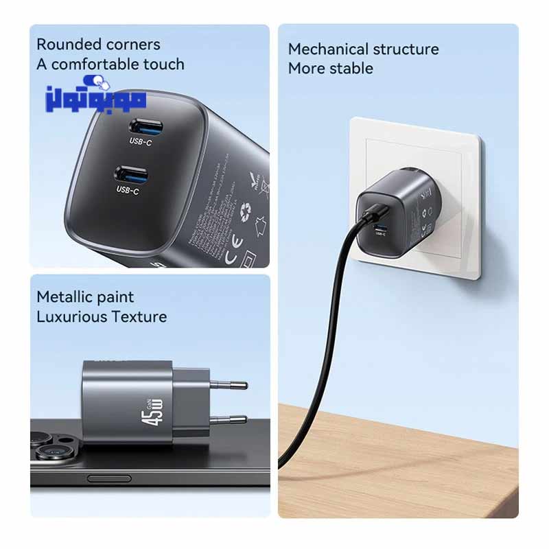 بدنه شارژر 45 وات یوسمز از ترکیب مواد ABS و PC ساخته شده که مقاومت بسیار بالایی در برابر حرارت، فشار و ضربه دارند. رنگ خاکستری مات آن ظاهری شیک و مدرن به شارژر بخشیده و به راحتی با سایر تجهیزات دیجیتال شما هماهنگ میشود. ابعاد (39×33.5×44.5 میلی متر) این محصول باعث شده تا آن را به راحتی بتوانید در کیف یا حتی جیب خود حمل کنید. این طراحی ارگونومیک، استفاده از شارژر را در هر شرایطی آسان و بیدردسر میکند.